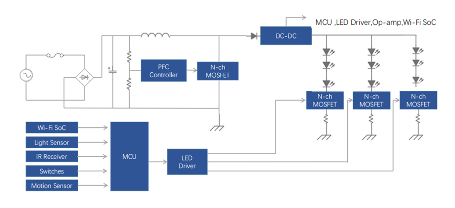 Application?descriptionLED lighting is revolutionary the third generation lighting system, which is meaningful for energy conservation and emission reduction, also for environmental protection. LED is widely used in the third generation LED lighting, which is mainly function as power management, brightness and color adjustment, eliminating ripple wave and stroboscopic. Siliup provide series high-voltage, low-voltage Mid-current or low current MOSFET with advantages of higher cost performance and high reliability.